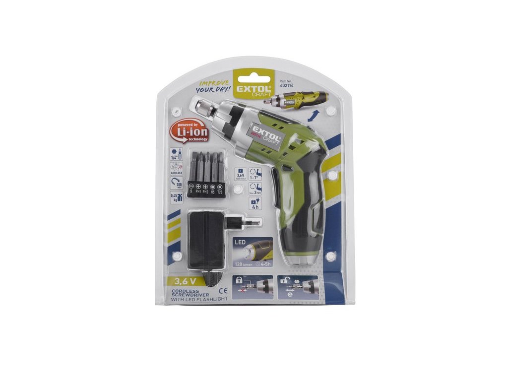 AKU šroubovák 3,6 V Li-ion 1.3 Ah, LED, nabíječka, sada bitů