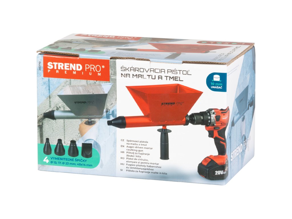 Spárovací pistole na maltu a tmely do vrtačky, ocelová, 3l, STREND PRO Spárovací pistole na maltu a tmely STREND PRO je praktický šnekový aplikátor určený pro upnutí do klasické akumulátorové vrtačky. Slouží k rychlému a čistému vyplňování spár mezi cihlami, kamenem či bloky bez zbytečného odpadu a nepořádku. Je to ideální pomocník pro domácí kutily a řemeslníky, kteří potřebují efektivně a plynule nanášet spárovací směsi nebo stavební tmely s minimální námahou.Hlavní přednosti:• Pohon na vrtačku: Mechanismus využívá vaši vlastní aku vrtačku (upnutí přes 10mm unašeč), což zajišťuje plynulé vytlačování materiálu bez únavy rukou.• Odolná konstrukce: Šneková hřídel z tepelně zpracované uhlíkové oceli a robustní ocelová násypka garantují dlouhou životnost nástroje i při práci s těžšími směsmi.• Vyměnitelné trysky: Pistole je dodávána s několika plastovými tryskami (PPR) různých průměrů, které umožňují přesné přizpůsobení toku materiálu šířce konkrétní spáry.• Čistá a rychlá práce: Díky bezprostřednímu podávání materiálu přímo do mezery se minimalizuje znečištění okolního zdiva a zamezuje se plýtvání materiálem.Použití:✔ Vyplňování spár lícového zdiva, cihelných pásků, kvádrů a přírodního kamene.✔ Rychlá a směrovaná aplikace cementových a tmelových směsí do stavebních dutin✔ Domácí rekonstrukce, zahradní zídky a hobby stavební úpravy.Technické parametry:• Typ nářadí: spárovací pistole na vrtačku• Materiál nádobky: uhlíková ocel (Q235)• Materiál šneku: tepelně zpracovaná uhlíková ocel• Materiál trysek: odolný plast (PPR)• Objem nádobky: 3 l• Upínání unašeče: 10 mm• Průměr kulatých trysek: 12 mm, 17 mm, 23 mm• Rozměr ploché trysky: 13,5 x 36 mmObsah balení:➡ Spárovací pistole s násypkou ➡ Přídavná rukojeť ➡ 4x vyměnitelná tryska ⚠ Upozornění:Tento produkt je dodáván jako samostatný nástavec, pro jeho funkčnost je nutné vlastnit akumulátorovou případně elektrickou vrtačku nebo šroubovák. Nářadí není určeno pro komerční či průmyslové nasazení.Pro plynulý posuv materiálu a zamezení jeho propadávání doporučujeme pracovat na nižší otáčky. Po skončení práce (nebo při delší pauze) je nezbytné pistoli i šnek okamžitě vyčistit vodou, aby nedošlo k zatvrdnutí směsi uvnitř tubusu.Šneková spárovací pistole STREND PRO zásadně zrychluje a usnadňuje nanášení tmelů a maltových směsí. Představuje mimořádně praktické řešení pro každého kutila, který chce dosáhnout profesionálně vyplněných spár u lícového zdiva či kamene s využitím běžného akumulátorového nářadí.Doplňkové parametry