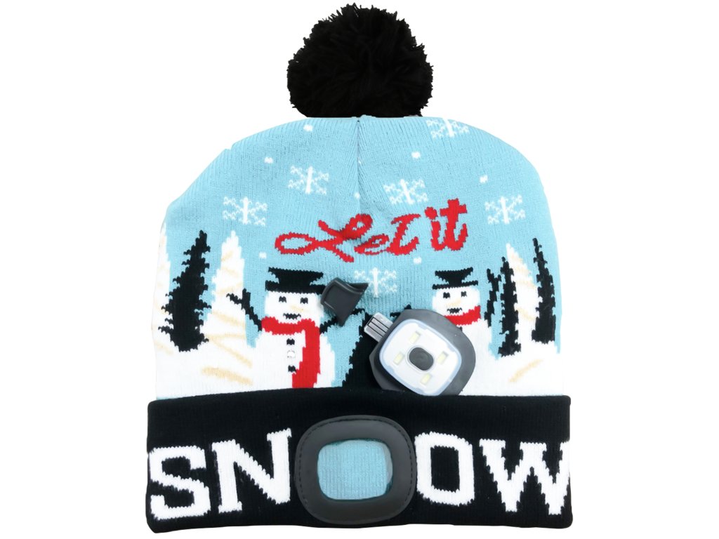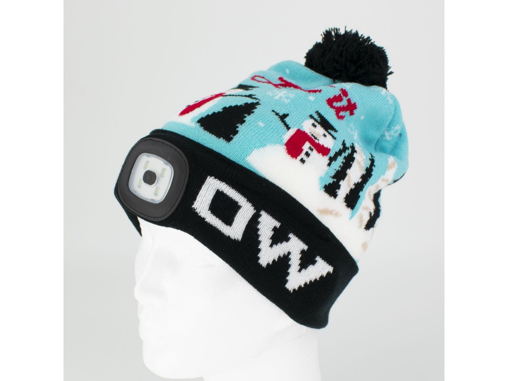 Čepice X-MAS Let It Snow s čelovkou LED 60 lm, USB, vel. L, modro-černobílá s bambulí