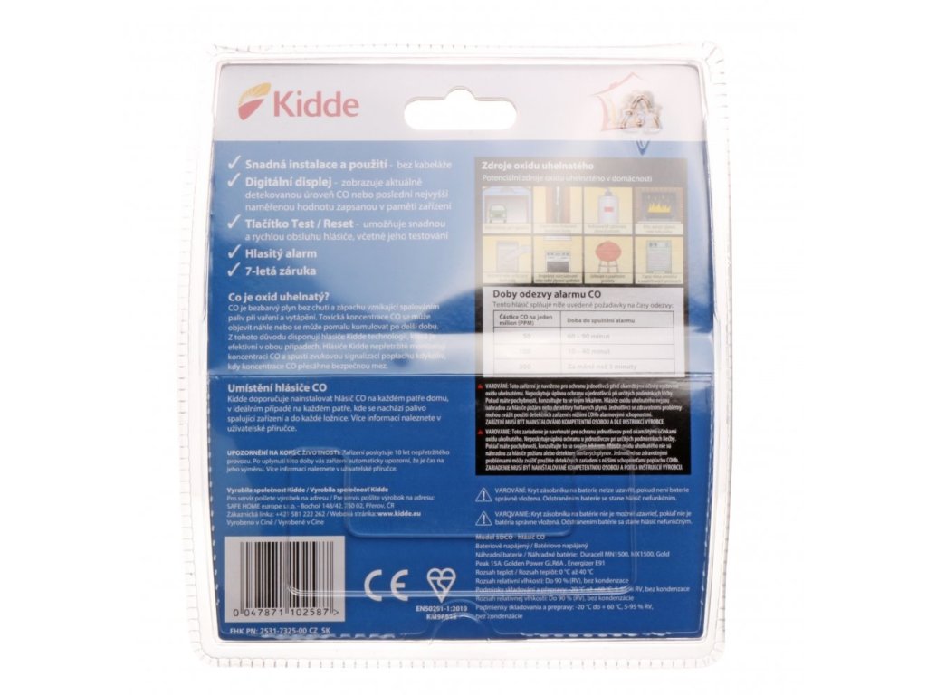 Technologie senzoru: Elektrochemická technologie Kidde - patent, patří mezi nejpřesnější technologie na světě.
