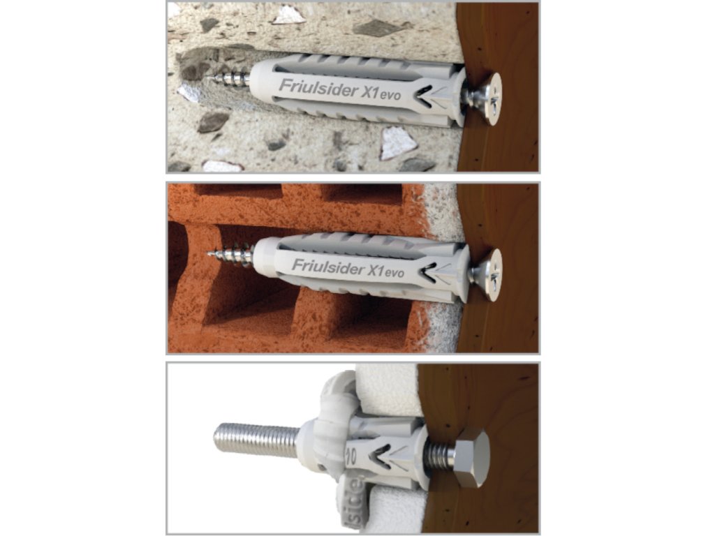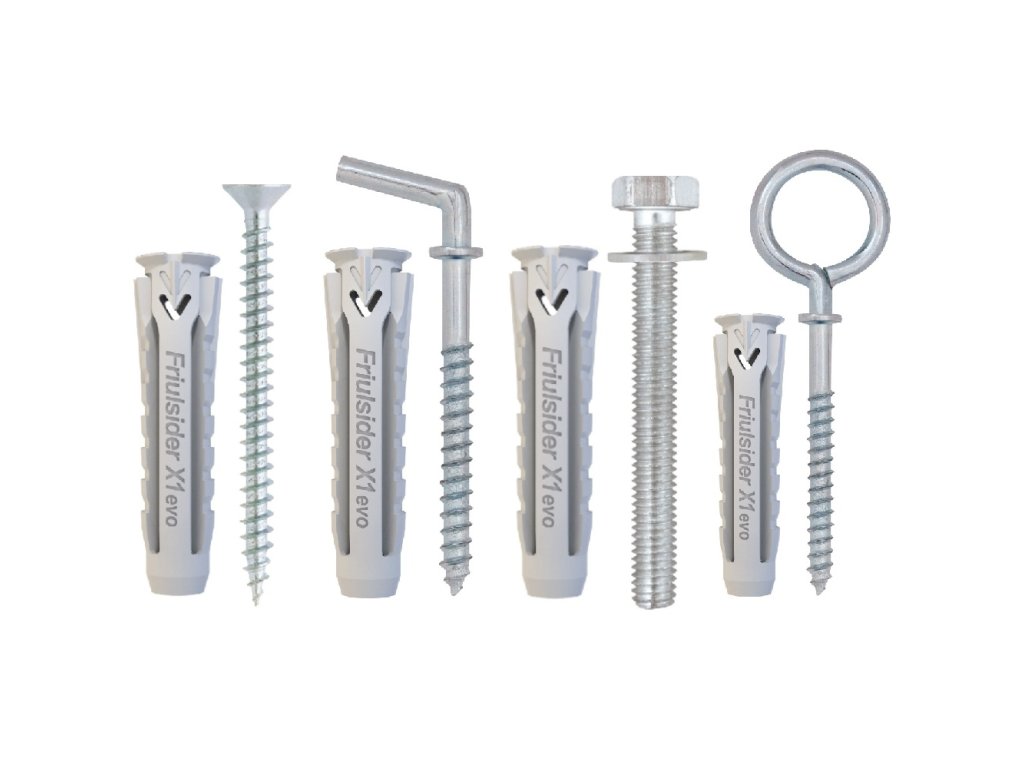 Univerzální kotvící hmoždinka vyrobená z vysoce kvalitního nylonu. Hmoždinka X1 evo je vhodná pro kotvení do velkého množství stavebních materiálů a to za použití různých typů šroubů a vrutů. Kotvení je možné do betonu, kamene, cihel, dutých a voštinových cihel, pórobetonu, sádrokartonu a stavebních materiálů. Pro kotvení do hmoždinky je možné použít klasické vruty, různé skoby se závitem, podstavcové šrouby, metrické šrouby, kombi šrouby, závitové tyče a další.Doplňkové parametry