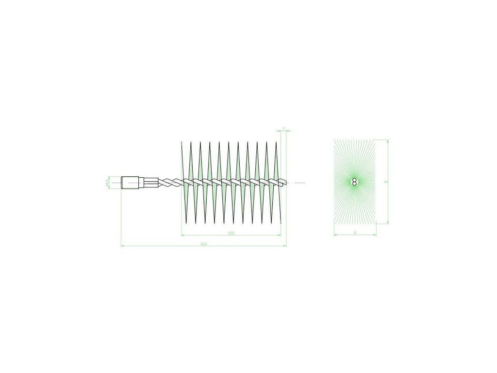 Kominická štětka na čištění klasických kouřovodů nebo prostoru v kamnech. Kartáče jsou v provedení spirála a jsou osazeny kalenými ocelovými dráty, které jsou stočeny mezi závity ocelových středových drátů. Je opatřen nalisovanou ocelovou koncovkou s vnějším závitem pro našroubování na nástavec potřebné délky.Doplňkové parametry