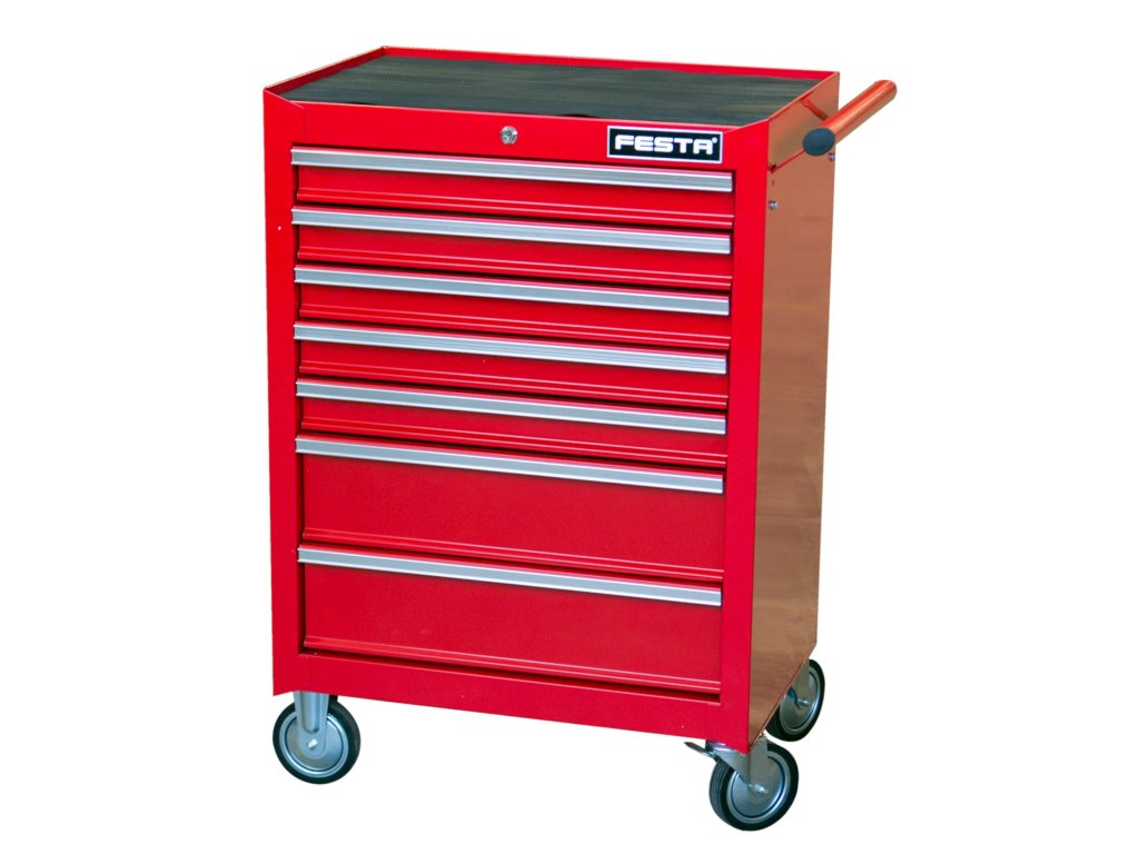 Vozík na nářadí FESTA z ocelové konstrukce a plechu, 7 zásuvek + samostatná odkládací přihrádka nahoře se zvednutým okrajem, posuvné zásuvky s kuličkovým ložiskem, zásuvky s protiskluzovými rohožemi, uzamykatelné pomocí centrálního zámku, praktická rukojet pro snadné ovládání. Vozík na nářadí je vybaven kovovými koly s pryžovou obručí, 2 otočná kola jsou opatřena nožní brzdou. 680 x 460 x 1020 mm.Doplňkové parametry