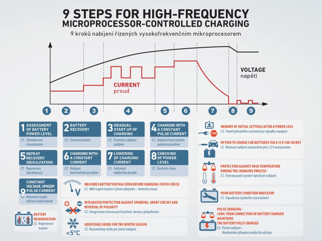 Nabíječka je určena pro nabíjení 12V nebo 6V olověných akumulátorů se zaplavenou elektrodou WET i Calcium, MF VRLA akumulátorů, AGM, i gelových a 12V LiFePO4 akumulátorů. Pro svou práci využívají automatický přepínací mód o vysoké frekvenci. Vestavěný mikroprocesor má naprogramovaných 9 fází procesu a zajistí nabití baterií až do 100% jejich originální kapacity. Po zapnutí nabíječky a připojení na akumulátor uvidíte na displeji jeho napětí a můžete si zvolit, jestli nabíjíte 12V baterii v autě, motocyklu, v zimě, LiFePO4 nebo 6V baterii. Pokud se při nabíjení detekuje částečně sulfátovaná baterie, zapne se automaticky funkci desulfatace baterie, která obnovuje její kapacitu. Nabíječka má ochranu proti přebíjení, přehřátí, zkratu, přepólování. Při výpadku napájení si zapamatuje nastavený typ nabíjení a po opětovném zapnutí ho nastaví. Nabíječka je velmi flexibilní ve způsobu připojení baterií a je vybavena různými koncovkami: klasické krokosvorky, očka, SAE konektor a 12V autozásuvka.9 nabíjecích stupňů:1 - vyhodnocení stavu baterie2 - zotavení baterie3 - pozvolné zahájení nabíjení4 - nabíjení konstantním pulzním proudem5 - regenerace(desulfatace)6 - nabíjení konstantním proudem 7 - snižování nabíjecího proudu8 - kontrola stavu9 - konstantní napětí, udržovací pulzní proudVstupní napětí (napájení): 230 V Výstupní napětí: 6 / 12 V Nabíjecí proud 12 V: 8 A Nabíjecí proud 6 V: 2 A Hmotnost: 0,75 kgDoplňkové parametry