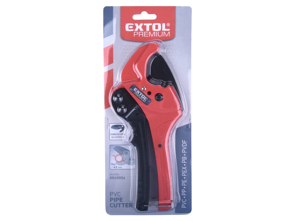 Spolehlivé a přesné nůžky na plastové trubky 0–42 mm EXTOL PREMIUM jsou navrženy pro rychlé a čisté stříhání širokého spektra plastových materiálů. Speciální trojúhelníkový břit potažený teflonem výrazně zlepšuje průnik materiálem, minimalizuje tření a zajišťuje hladký řez bez deformace trubky.Velkou výhodou tohoto modelu je nastavitelný čep, díky němuž lze přizpůsobit úhel otevření břitu podle velikosti trubky. U menších průměrů (do cca 26 mm) usnadní rychlé stříhání, zatímco pro plný rozsah až 42 mm poskytuje stabilní vedení řezu.Klíčové vlastnosti:• Nůžky na plastové trubky 0–42 mm – široký rozsah pro instalace vody a topení• Trojúhelníkový břit potažený teflonem – lepší průnik materiálem, menší tření, čistý řez• Nastavitelný doraz/čep – pro rychlejší práci s menšími průměry a stabilní střih u větších průměrů• Ostří z oceli 5Cr13, tvrdost HRC 54–57 • Vhodné pro materiály PVC, PPR, PP, PE, PEX, PB, PVDF • Odolná konstrukce a ergonomické rukojeti s protiskluzovou úpravou• Ergonomické rukojeti s protiskluzovou úpravou pro bezpečný úchop✔ instalace plastových rozvodů vody a topení ✔ střihání trubek při lisování, svařování i opravách✔ profesionální instalatéři i domácí kutilové✔ plastové trubky všech běžných průměrů do 42 mmTechnické parametry:• Rozsah střihu: 0 - 42 mm• Materiál břitu: 5Cr13, tvrdost HRC 54–57• Kompatibilní materiály: PVC, PPR, PP, PE, PEX, PB, PVDF• Mechanismus: ráčnový• Značka: EXTOL PREMIUMTyto nůžky EXTOL PREMIUM 0–42 mm patří mezi praktické a výkonné nástroje pro řezání plastových trubek v domácích i profesionálních podmínkách. Teflonem potažený trojúhelníkový břit, nastavitelný doraz a odolné ostří zaručují čistý řez a pohodlnou práci.Výborná volba pro každého, kdo potřebuje spolehlivé nůžky s dobrým poměrem cena/výkon.Doplňkové parametry