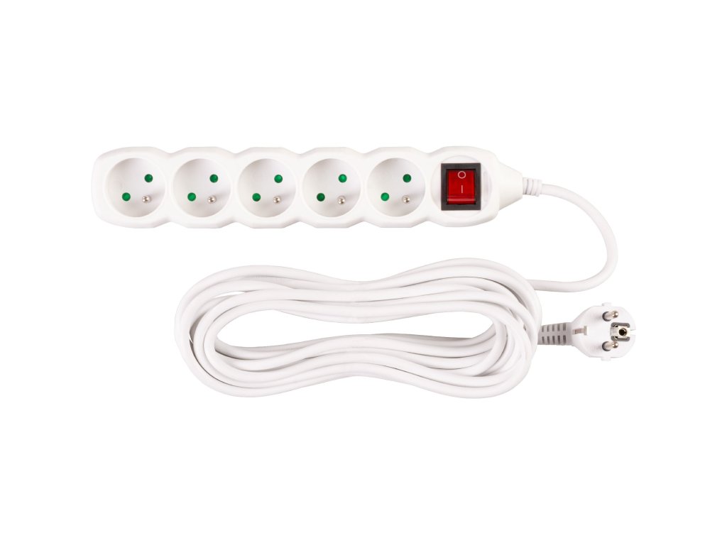 Prodlužovací kabel s vypínačem 7 m, 5 zásuvek, bílý – flexibilní napájení s praktickým ovládánímProdlužovací kabel s pěti zásuvkami a délkou 7 metrů ti poskytne maximální volnost při rozmístění elektrospotřebičů v domácnosti, kanceláři i dílně. Díky praktickému kolébkovému vypínači můžeš pohodlně ovládat napájení všech připojených zařízení jedním stiskem – bez nutnosti vytahování ze zásuvky.Pět zásuvek ti umožní připojit více zařízení současně – např. notebook, tiskárnu, lampu nebo router. Sedmimetrový kabel poskytne dostatečný dosah i v rozsáhlejších prostorách nebo při napájení za nábytkem.Hlavní výhody:• 5 zásuvek pro současné napájení více zařízení• 7metrový kabel – dostatečný dosah i ve větších místnostech• Kolébkový vypínač – snadné zapnutí a vypnutí napájení• Odolné bílé provedení – univerzální a nenápadné• Bezpečné a spolehlivé použití v domácnosti i kancelářiIdeální použití:• Rozvod napájení podél stěn, za nábytkem či pracovním stolem• Připojení spotřebičů jako je TV, lampy, PC, tiskárna nebo nabíječky• Ideální do obývacího pokoje, pracovny, dílny nebo na chalupuDoplňkové parametry