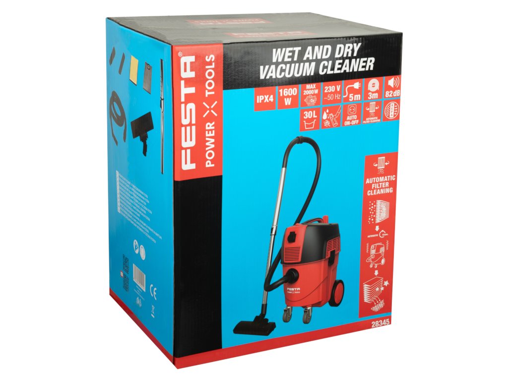 Vysavač FESTA s automatickým oklepem, 30 l, 1600 W FESTA vysavač s oklepem 30 l / 1600 W je výkonný průmyslový vysavač na suché i mokré vysávání, určený pro dílny, stavby i náročné úklidové práce. Díky automatickému systému oklepu HEPA filtru si udržuje stabilní sací výkon i při dlouhodobém provozu a práci s jemným prachem.Vysavač je vybaven zásuvkou pro připojení elektrického nářadí se systémem automatického zapnutí a vypnutí, což výrazně usnadňuje práci například při broušení nebo řezání. Robustní konstrukce, objemná nádoba 30 l a praktický podvozek s kolečky zajišťují pohodlnou manipulaci i v náročném prostředí.Klíčové vlastnosti:• Mokré i suché vysávání – prach, jemné nečistoty i kapaliny• Automatický oklep HEPA filtru • Zásuvka pro připojení nářadí s automatickým spínáním• Objem nádoby 30 litrů • Sací podtlak 20 kPa • Krytí IPX4 • Akční rádius až 10 m Použití:Ideální pro dílny, stavební práce, garáže a průmyslové provozy. Vhodný pro vysávání prachu, pilin, stavebních nečistot i kapalin. Díky zásuvce pro připojení nářadí je vhodný jako odsávání k bruskám, pilám nebo frézám.Technické parametry:• Napětí / frekvence: 230 V / 50 Hz • Příkon: 1600 W • Objem nádoby: 30 l • Podtlak: ⋝ 17 kPa • Délka kabelu: 5 m • Hadice: 3 m • Hmotnost: 13,4 kg• Krytí: IPX4⚠ Příslušenství v balení:✔ Sací hadice 3 m✔ Teleskopická pochromovaná trubice✔ Kombinovaná podlahová hubice✔ Hubice na tvrdé podlahy✔ Štěrbinová hubice✔ HEPA filtr✔ Filtrační sáček pro opakované použití✔ Hadicová redukceFESTA vysavač s automatickým oklepem 30 l je robustní a výkonný průmyslový vysavač 1600 W s HEPA filtrem, zásuvkou pro nářadí a vysokým sacím výkonem. Spolehlivé řešení pro profesionální použití i náročné domácí práce.Doplňkové parametry