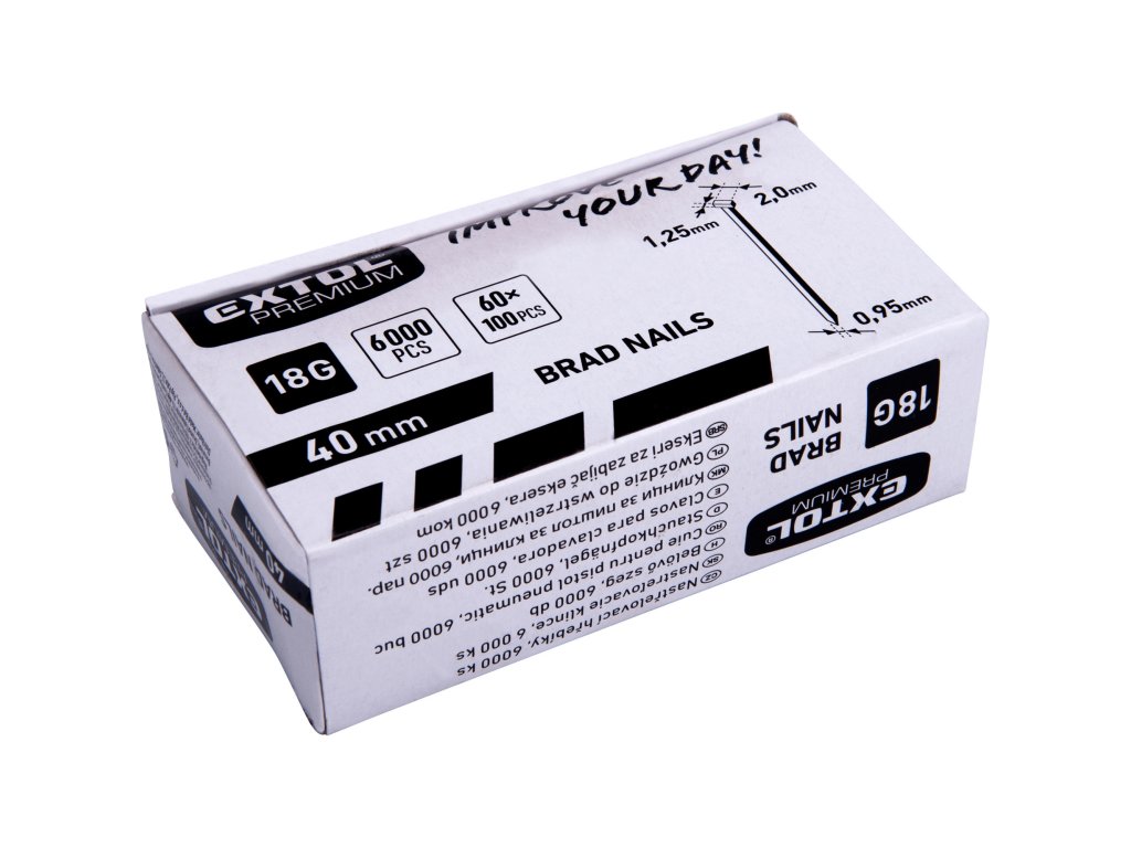 Hřebík nastřelovací, typ F (18G), 40 mm, 6000 ks, EXTOL PREMIUM Kvalitní nastřelovací hřebíky typu F (18G) určené pro přesné a pevné spojování při použití s kompatibilními hřebíkovačkami (brad nailer). Díky délce 40 mm, jemnému profilu 18G a malé hlavě 2 mm jsou ideální pro truhlářské, montážní a dokončovací práce, kde je kladen důraz na čistý vzhled spoje.Hřebíky mají rozměr drátu 1,25 × 0,95 mm a jsou pozinkované, což zvyšuje jejich odolnost proti korozi a prodlužuje životnost spoje. Dodávají se v praktickém balení 6000 ks, vhodném pro dílny i profesionální provozy. Značka EXTOL PREMIUM garantuje konzistentní kvalitu, přesné zpracování a spolehlivý chod v nářadí.Klíčové vlastnosti:• nastřelovací hřebíky typ F (18G) • délka 40 mm • jemný profil pro přesnou práci• malá hlava 2 mm – nenápadný spoj• rozměr drátu 1,25 × 0,95 mm • pozinkované provedení proti korozi• velké balení 6000 ks ✔ lišty, obložky a rámy✔ nábytek a truhlářské práce✔ montáž MDF, překližky a tenkých desek✔ dokončovací a interiérové práceTechnické parametry:• typ: F (18G) • délka: 40 mm • průměr hlavy: 2 mm • rozměr drátu: 1,25 × 0,95 mm • povrchová úprava: pozink • balení: 6000 ks • kompatibilita: hřebíkovačky pro F / 18G Tyto nastřelovací hřebíky EXTOL PREMIUM F 18G, 40 mm jsou spolehlivou volbou pro každého, kdo potřebuje pevné, přesné a estetické spoje při profesionálních i hobby pracích. Díky kvalitnímu zpracování minimalizují zasekávání v nářadí a zajišťují plynulý postup práce.Doplňkové parametry