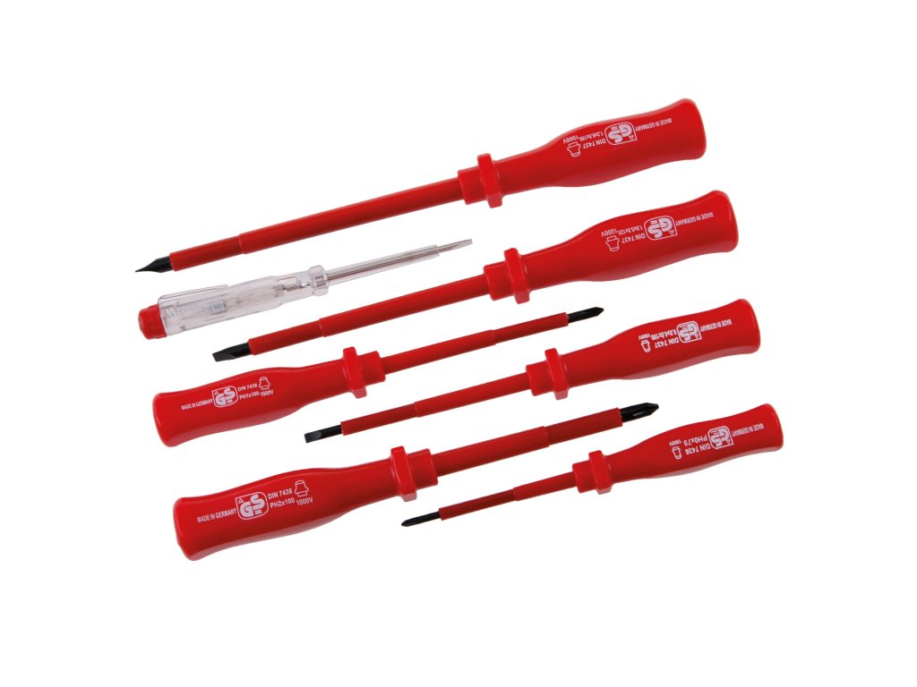 Sada nejpoužívanějších typů elektrikářských šroubováků. Šroubováky mají certifikaci elektro VDE 1000 V, IEC/EN 60900-2004. Kovový dřík je vyroben z velmi kvalitní chromvanadiové oceli s kaleným hrotem a je magnetický. Ergonomicky tvarované rukojeti. Počet v sadě: 7 Šroubováky ploché: 3 x 75 - 5,5 x 125 - 6,5 x 150 mm Šroubováky PHILIPS: PH0 x 75 - PH1 x 100 - PH2 x 100 mm Šroubováky POZIDRIVE: - Šroubováky TORX: - Elektro ochrana: VDE 1000 V, GS, IEC60900:2004 Úderové: - Extra: zkoušečkaDoplňkové parametry