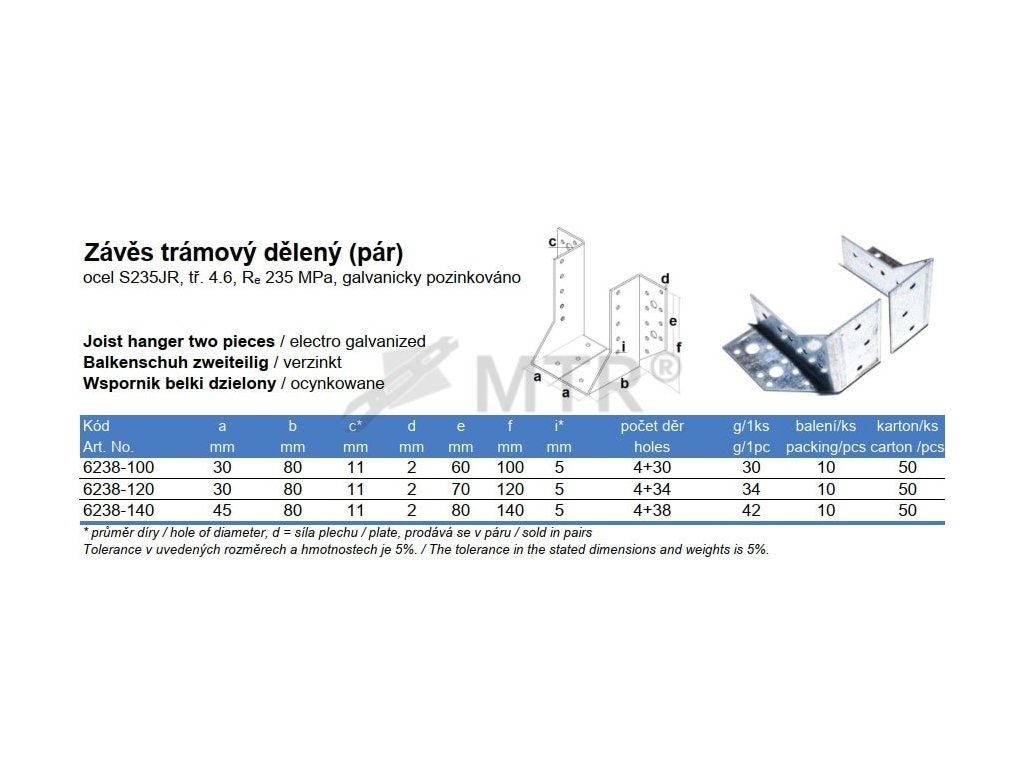 Rozměry: Šířka trámu: min. 60 mm, Hloubka třmenu: 80 mm, Celková výška: 120 mm.