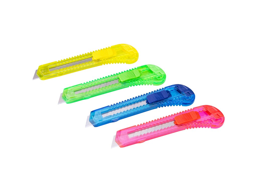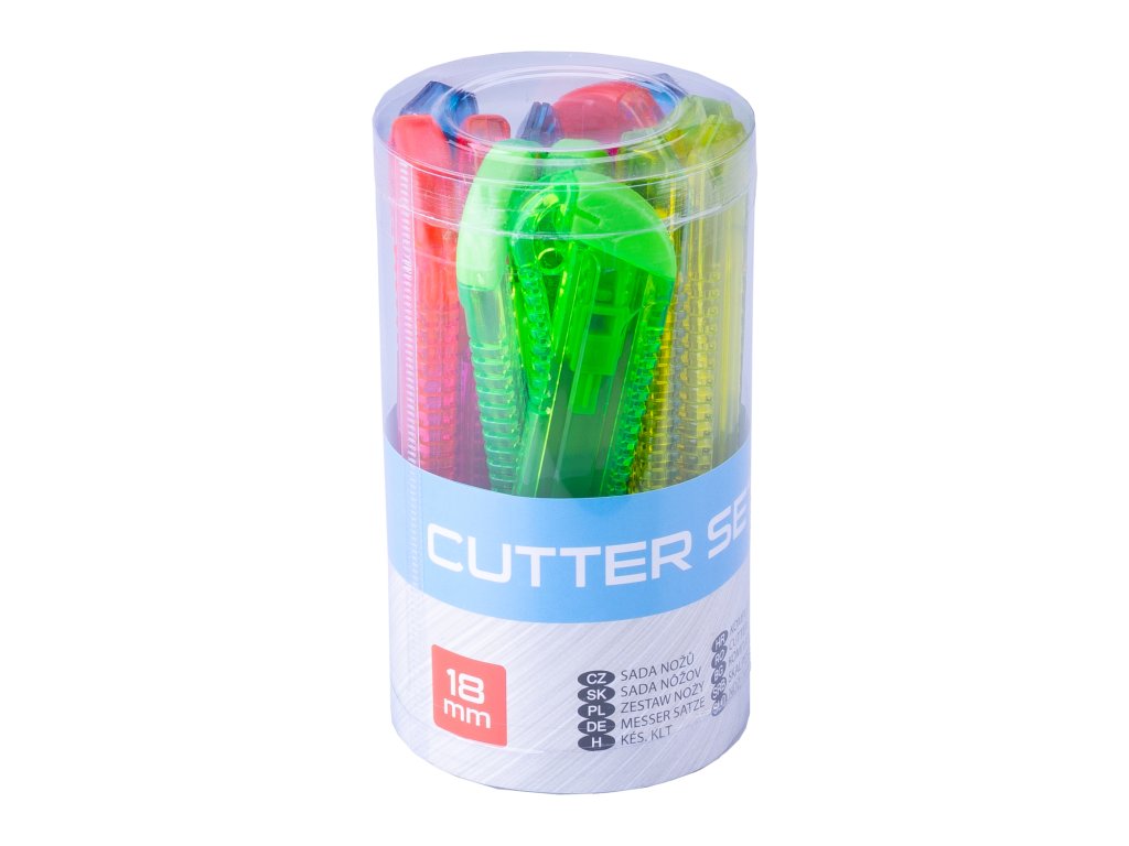 Praktická sada 12 nožů na ulamovací břity s plastovým tělem. Posuv břitu se provádí plastovým posuvníkem s aretací. Šířka čepele: 18 mm Materiál těla (rukojeti): plast Ocelová výztuha: ne Posuv / aretace: posuvník s aretací Extra: -Doplňkové parametry